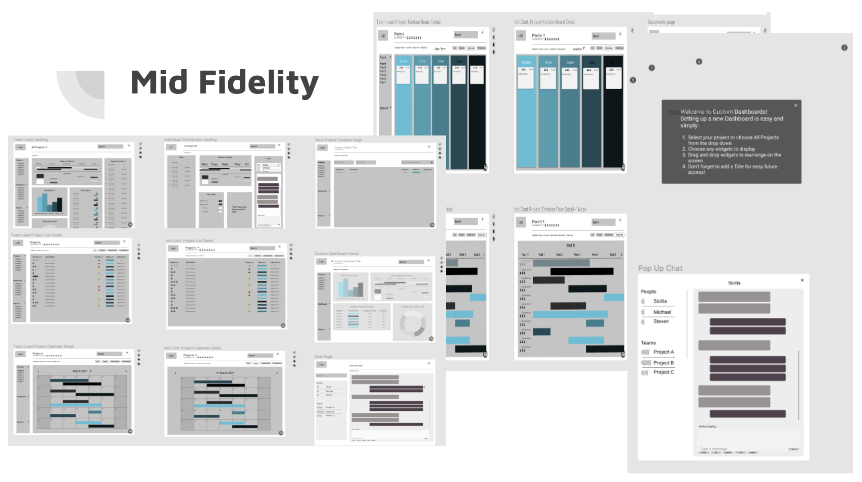 Survey: We created a survey that included four different sections, demographics, team member experience, team lead experience, and task managing questions. 61% of individual contributor responses selected slow and inefficient processes as a challenge working on the team, making this the largest pain point identified. 62% of all responses (team lead - 75%; ind contributor - 56.5%) selected lack of communication as a major pain point for their current task management system. Another users said “That there never seems to be one system that meets my needs, so I find myself jumping between software solutions.” Another user said that “they would like it if their whole company used a task managing system so everyone knows what is going on and who is going on vacation and needs coverage.” Overall, our survey responses gave us informative information that helped us form our personas.